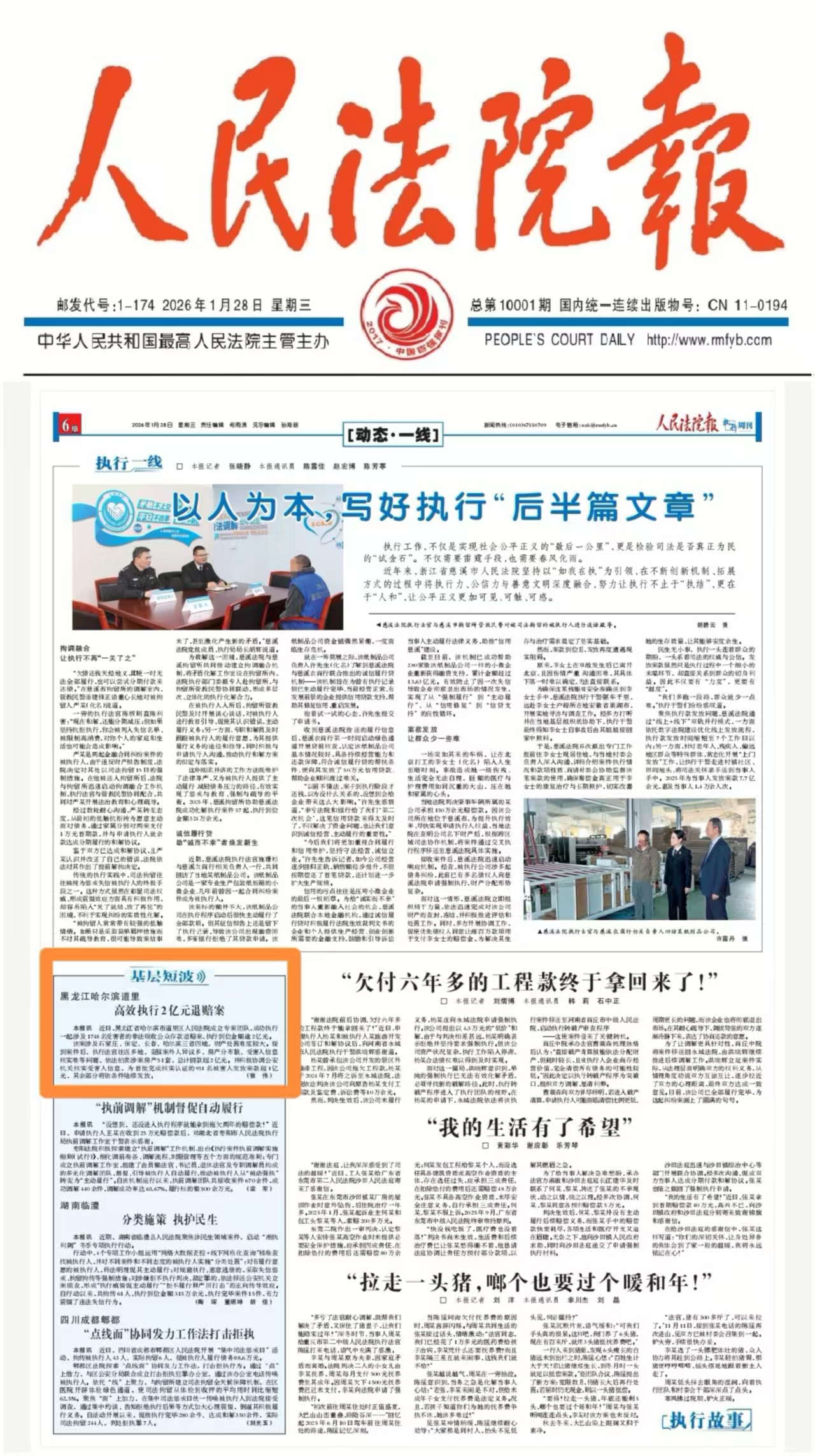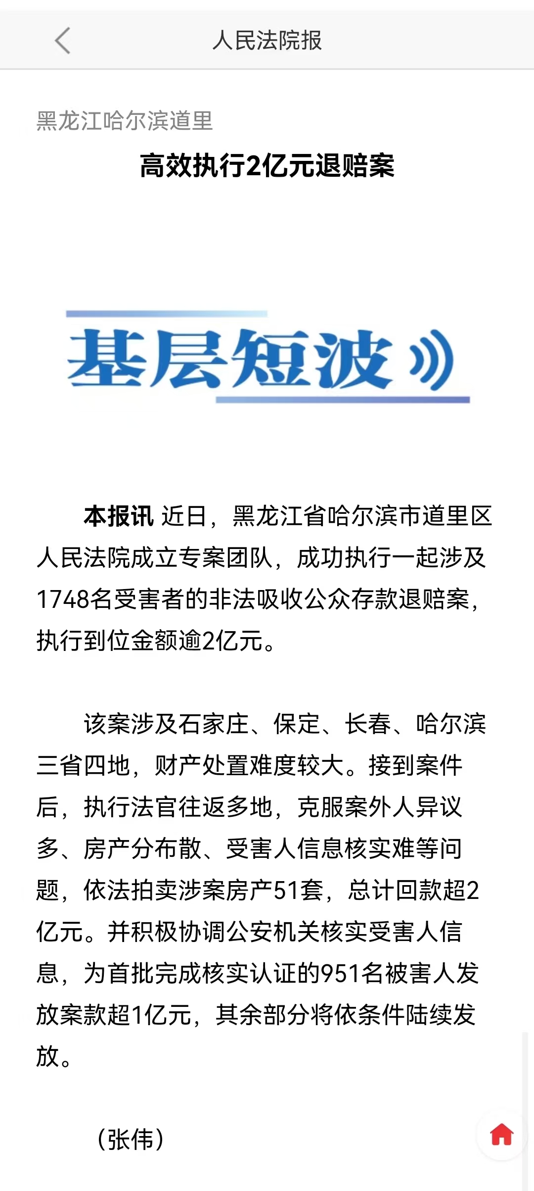 媒体关注丨《人民法院报》:黑龙江哈尔滨道里 高效执行2亿元退赔案