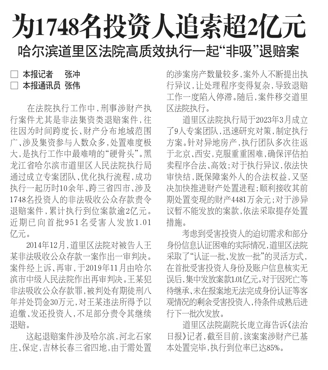在法院执行工作中,刑事涉财产执行案件尤其是非法集资类退赔案件,往往因为时间跨度长、财产分布地域范围广、涉及集资参与人数众多,处置难度极大,是执行工作中最难啃的“硬骨头”。黑龙江省哈尔滨市道里区人民法院执行局通过成立专案团队、优化执行流程,成功执行一起历时10余年、跨三省四市、涉及1748名投资人的非法吸收公众存款责令退赔案件,累计执行到位案款逾2亿元。近期已向首批951名受害人发放1.01亿元。